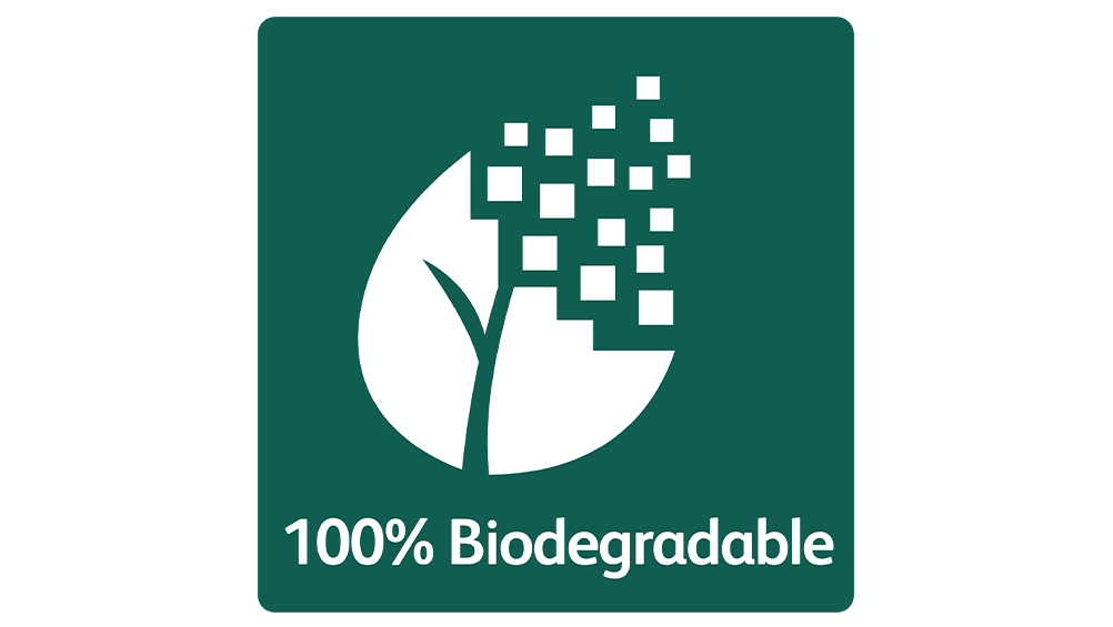*Based on an independent OECD 301B assessment. 301B is a globally recognized aerobic biodegradation test that monitors the degree of activity of microorganisms (CO2 evolution) exposed to a material during 28 days, thus resulting in a carbon material reading and the biodegradability of the product.