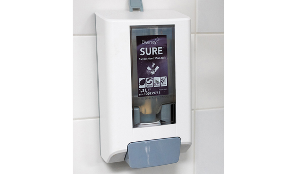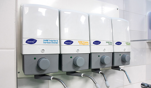 • Diversey’s dispensers offer less waste, proper dosage of materials and are easier to use