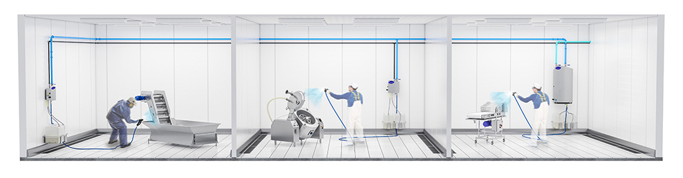 Handmatige gecentraliseerde OPC is optimaal voor fabrieken waar geconcentreerde chemicaliën niet zijn toegestaan in de proceskamers. In een gecentraliseerde configuratie worden alle chemicaliën vooraf verdund in een aparte, geïsoleerde chemicaliënruimte en verdeeld via een reeks pijpleidingen. In de chemicaliënruimte wordt de druk van het spoelwater opgevoerd door middel van een meertraps pomp. Elke OPC-satellieteenheid ontvangt voorverdund reinigingsschuim, voorverdund ontsmettingsmiddel en water onder hoge druk.